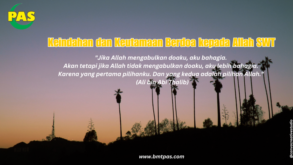 www.bmtpas.com Doa merupakan salah satu bentuk komunikasi yang paling intim antara seorang hamba dengan Allah SWT. Sebagaimana perkataan Ali bin Abi Thalib, “Jika Allah mengabulkan doaku, aku bahagia. Akan tetapi jika Allah tidak mengabulkan doaku, aku lebih bahagia. Karena yang pertama pilihanku. Dan yang kedua adalah pilihan Allah.” Perkataan ini menunjukkan betapa pentingnya doa dalam kehidupan seorang Muslim dan betapa bijaksananya menerima setiap ketetapan Allah dengan ikhlas.