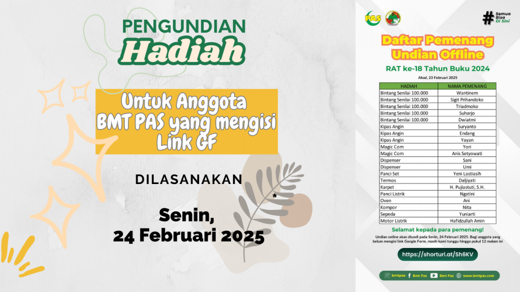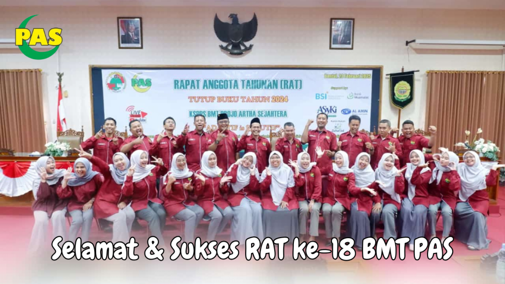 www.bmtpas.com Rapat Anggota Tahunan (RAT) BMT PAS tahun buku 2024 telah sukses terlaksana dengan lancar. Acara ini diselenggarakan pada hari Ahad, 23 Februari 2025, bertempat di ruang Rapat Paripurna DPRD Bantul. Kegiatan dimulai pukul 08.00 hingga 12.00 dengan dihadiri oleh berbagai pihak terkait, termasuk perwakilan dari Puskopsyah Bantul dan Dinas Koperasi dan UKM DIY.